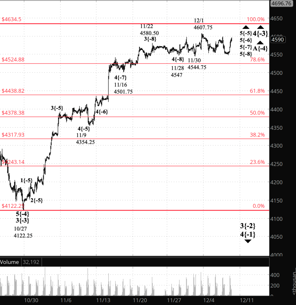 What does it mean? The trigger point was 4634.50, the start of the 1st wave preceding what had been labeled a 4th-wave upward correction that began on October 27. A rule of Elliott Wave Theory says that a 4th wave never moves above the beginning of the preceding 1st wave. When it does happen, it’s time to reanalyze the chart so that the rule remains intact, so that the unthinkable never happened.