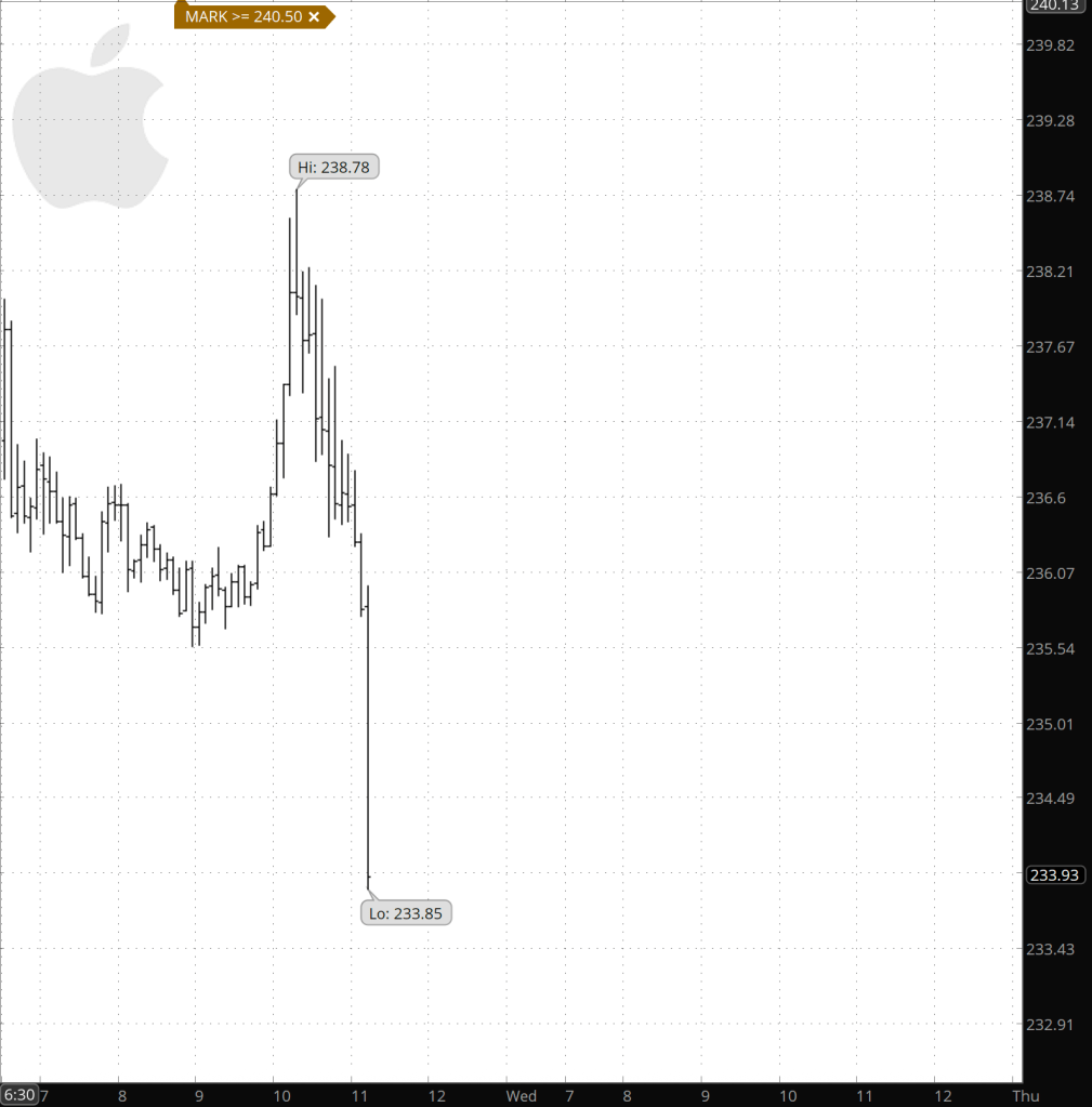[S&P 500 E-mini futures at 3:30 p.m., 80-minute bars, with volume]