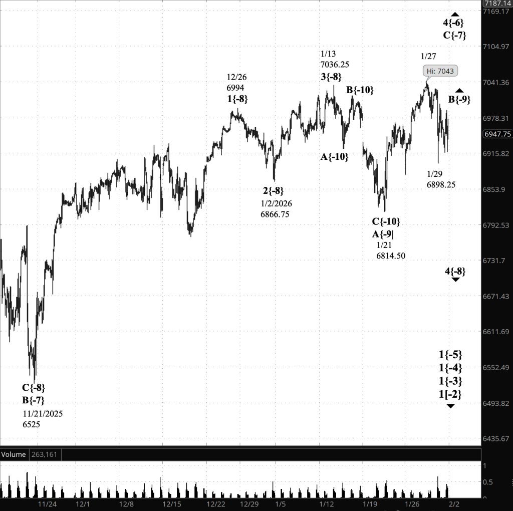 What does it mean? In Elliott Wave terms, yesterday’s rise increased the likelihood that rising wave B{-9} (begun January 21) is still underway. However, the market has not yet pushed above 7043 (the January 27 high), so the alternative scenario remains open: that B{-9} ended at 7043 and declining wave C{-9} has begun. Until price makes a decisive move—above 7043 to confirm B{-9}, or back down through key supports to strengthen C{-9}—the B{-9} count remains the status quo.