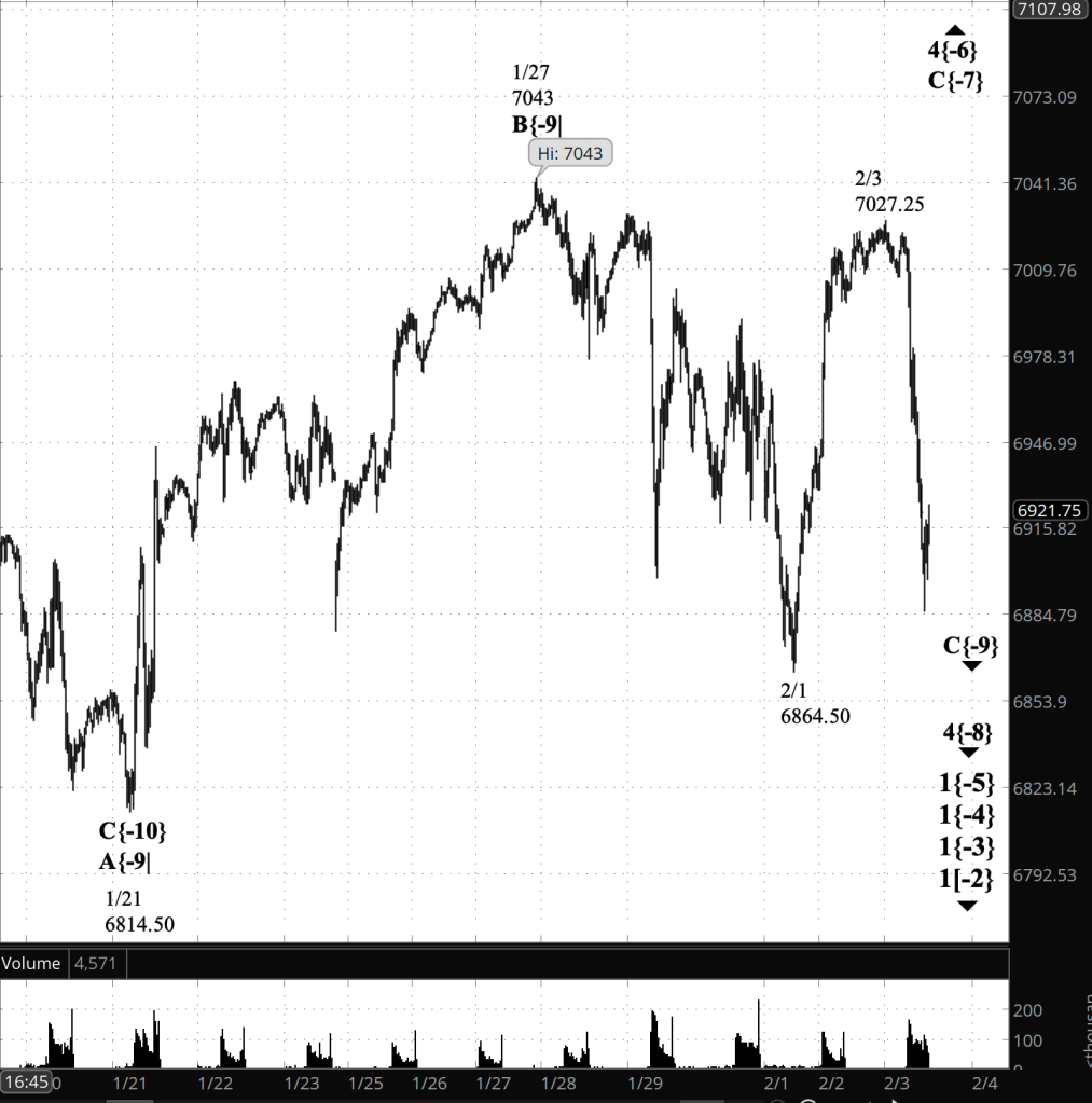 With that caveat in mind, here’s the updated analysis: the January 27 peak at 7043 is now treated as the end of rising wave B{-9}, and the decline from that high is treated as the start of falling wave C{-9}, which appears to still be underway. I have not labeled the C{-9} subwaves yet, but I’ve marked two turning points with dates as likely candidates.