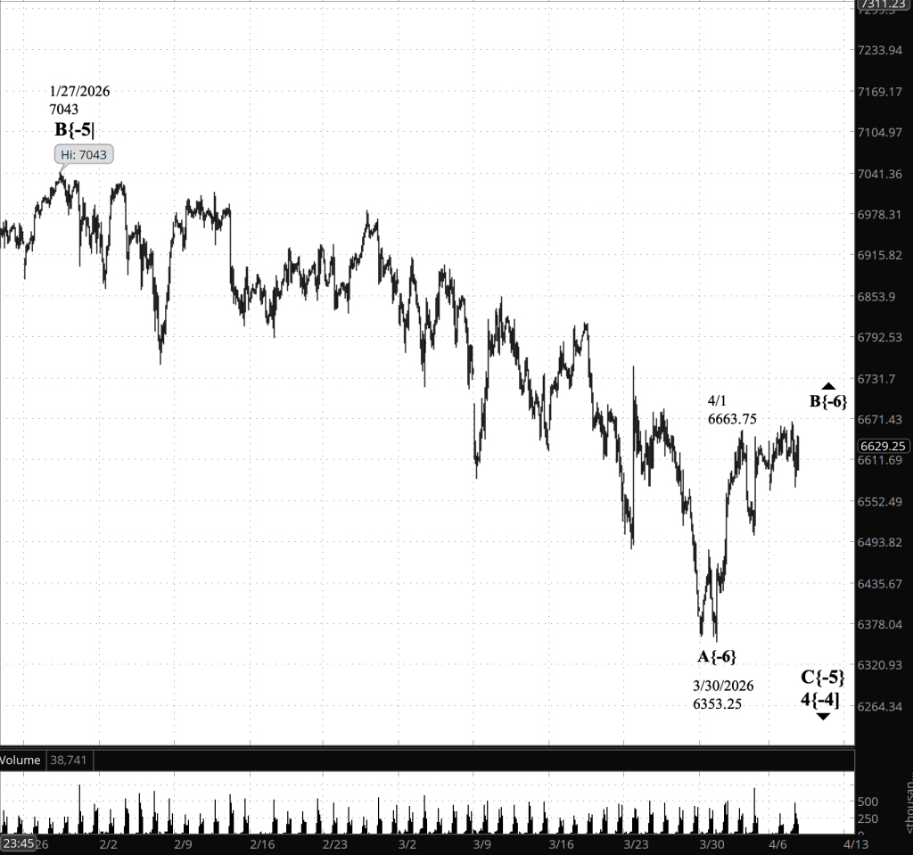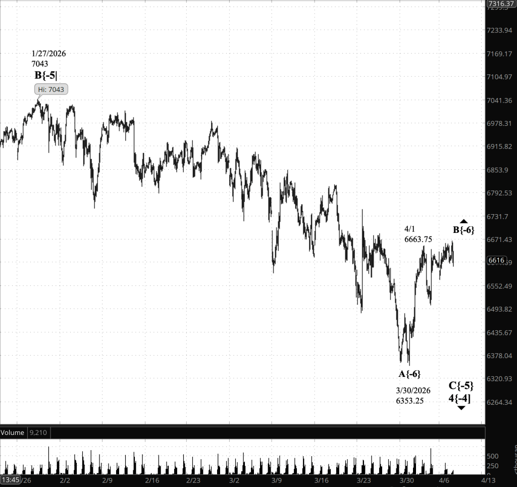 Decision Points. The key question is whether rising wave B{-6} has completed its final subwave, C{-7}. The current rally has reached the mid-6800s, placing it within the expected resistance zone for B{-6}, roughly 6620–6680 and extending higher as momentum carried beyond the initial target. A continued hold above 6800, followed by a push to new recovery highs, would argue that C{-7} is still extending and that B{-6} is not yet complete. Conversely, a decisive break below 6760 would be the first signal that upward momentum has failed. A further decline below 6652.25, the overnight low, would strongly suggest that B{-6} has ended and that declining wave C{-6} is underway. Until that lower boundary is broken, the upward structure of B{-6} remains intact, but the risk of reversal is elevated given the maturity of the move.